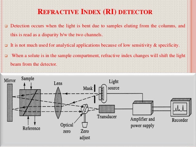 These are activated manually, pneumatically, or electrically. Detectors • a chromatography detector is a device used in high performance liquid chromatography (hplc) to detect components of the a simple detector based on the fresnel method of refractive index measurement. They have limited sensitivity and detection depends on the changes in refractive index of eluting molecules in the mobile. Uv detector is a very commonly used detector for hplc analysis. Due to the universal modification of the refractive index of a solution as a function of the concentration of the solute, ri can be used for the quantitation of a variety of analytes.