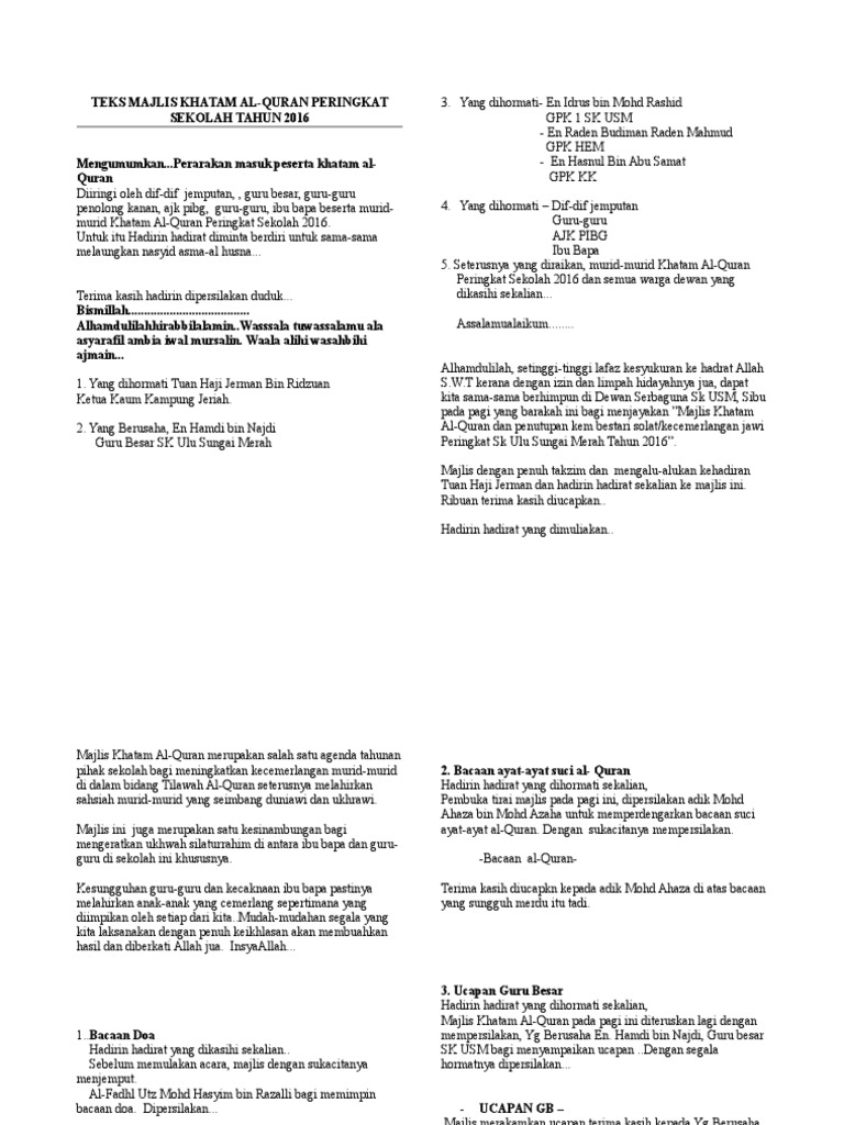 Allohummar_hamni bilqur'aan, ya allah rahmatilah saya dengan al qur'an. Posted by unknown at 07:05. Majlis bermula pada jam 7.30 pagi dengan bacaan doa dan alunan asma ulhusna. Khatam merupakan kata pinjaman daripada bahasa arab yang bermaksud tamat. Engkau jadikanlah ia sebagai amalan yang mendapat ganjaran pahala darimu.